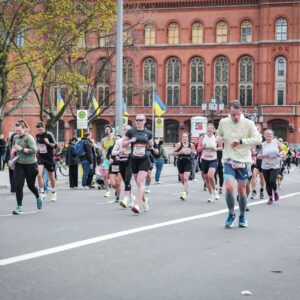 Rond kilometer 16 slaat de vermoeidheid toe en voel ik dat de wind inmiddels meespeelt. Het parcours gaat heen en weer over de Karl-Marx Allee, die een paar hoogtemeters bevat die op dit punt voelen als een echte klim. Inmiddels ben ik meer aan het rekenen dan het genieten. Maar dat stelt me ook gerust: zelfs als ik nu wat rustiger aan zou doen, loop ik nog steeds flink onder mijn persoonlijk record. Maar zolang het goed blijft gaan, probeer ik mijn 5 minuut per kilometer aan te houden. Inmiddels loop ik ook tussen deelnemers die ongeveer hetzelfde tempo hebben, al moet ik nog steeds zigzaggen en soms een stoeprandje meepakken om mensen in te halen.